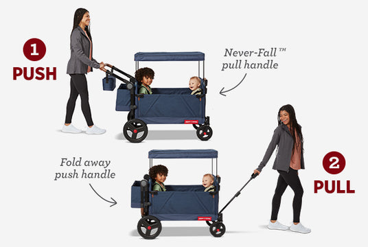 Versatile push & pull capabilities make this premium wagon comfortable to maneuver regardless of the type of journey your family is taking. Featuring a Never Fall™ pull handle and a built-in adjustable push bar, use the Radio Flyer Atlas as a push wagon or a folding pull wagon. The two 5-point safety harness seat belts and a rear brake keep babies as young as 12 months secure and comfortable.