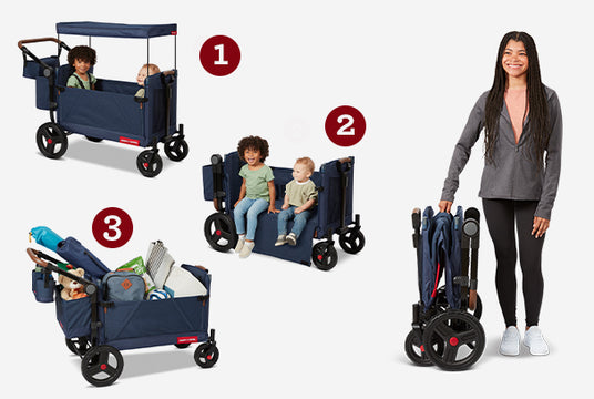 With three different seating modes and an easy one-hand fold, the Radio Flyer Atlas push-pull wagon is ready to go when you are, no matter the occasion. Push or pull little riders on a walk around the neighborhood, convert to bench seating for a picnic in the park, or haul home all of your farmers market finds. Easily store your Atlas wagon between rides using its easy fold feature, allowing it to fit compactly even in tight storage areas.
