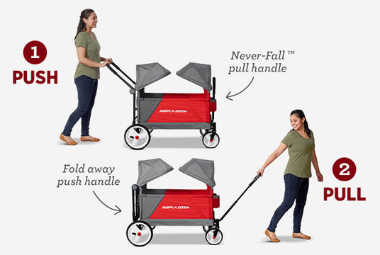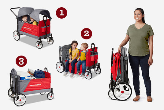 With three different seating modes, the Radio Flyer Discovery Wagon is ready to go when you are, no matter the occasion. Push or pull little riders on a walk around the neighborhood, convert the push pull wagon to bench seating for a picnic in the park, or haul home all of your farmers market finds. Its one-hand folding design makes this baby wagon with canopy easy to store and transport. The Discovery Stroll 'N Wagon® with Canopies is your go-to dual canopy wagon for adventures big and small.