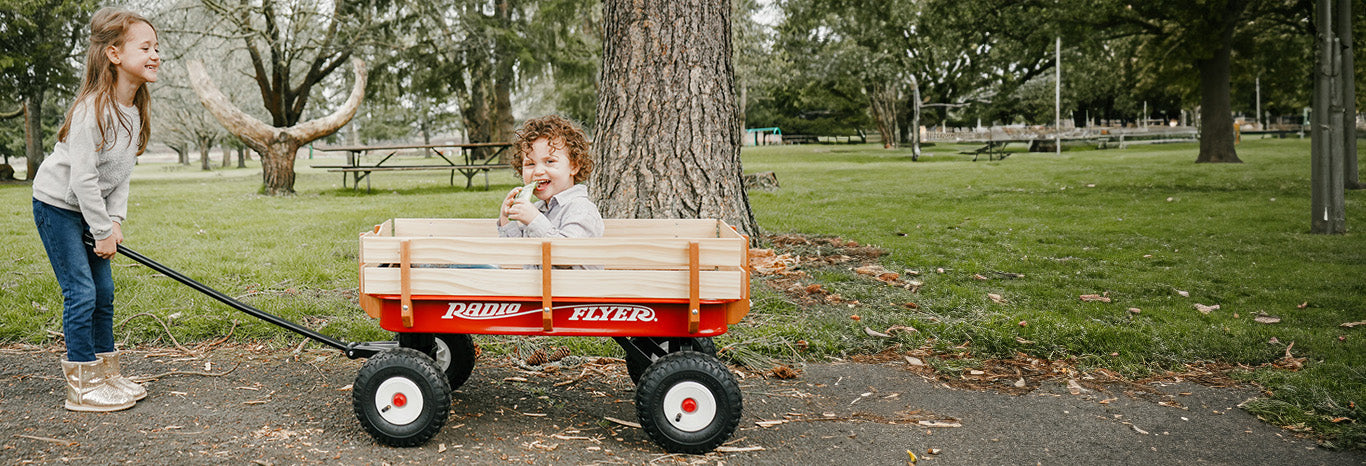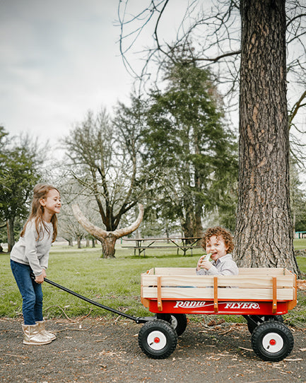 Blending the Original Classic Red Wagon body with wooden stake sides creates a premium and timeless look for an all-terrain kids’ wagon that is both durable and comfortable for riders. Plus, the sturdy, high wood sides make this wooden wagon ideal for all of your cargo- hauling needs.