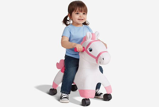 The pony toy's EZ-Glide wheels spin 360⁰, allowing children to create their own motion and move in any direction. Enjoy the ride-on pony anywhere from hardwood floors to the driveway or sidewalk – these rolling caster wheels are safe for both indoor and outdoor use.