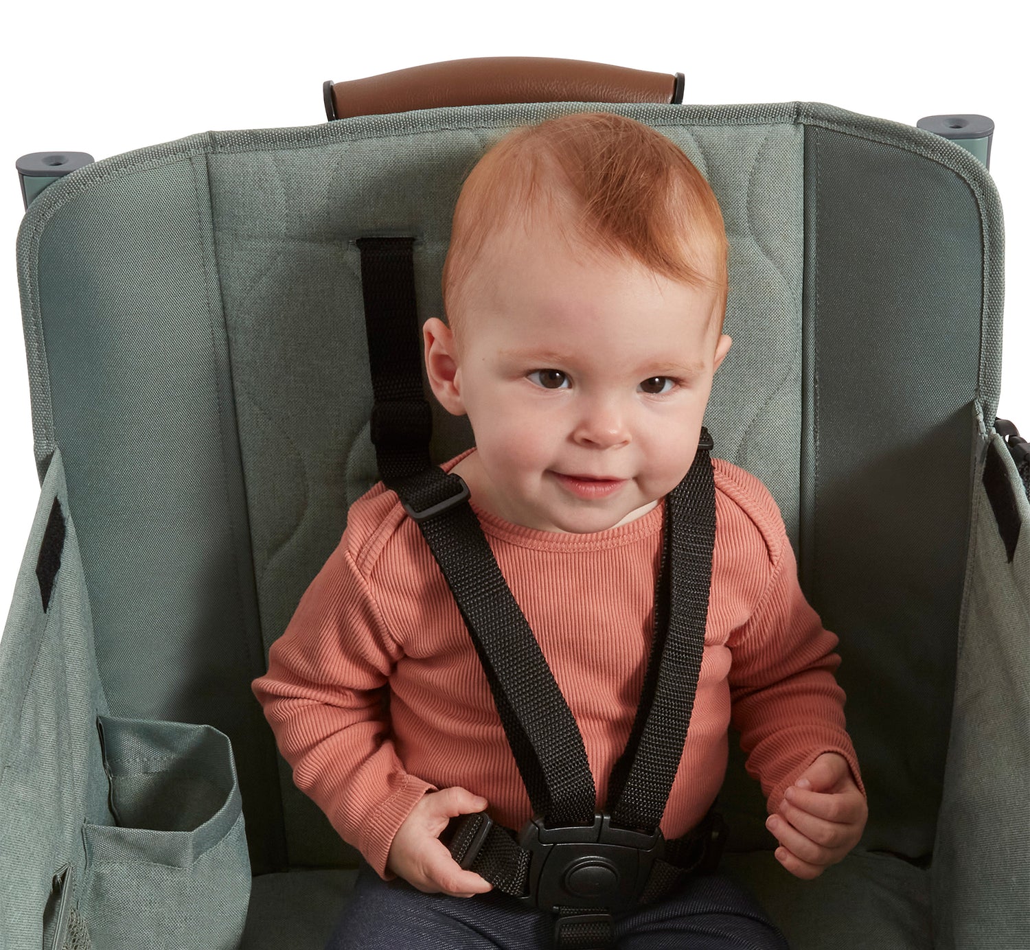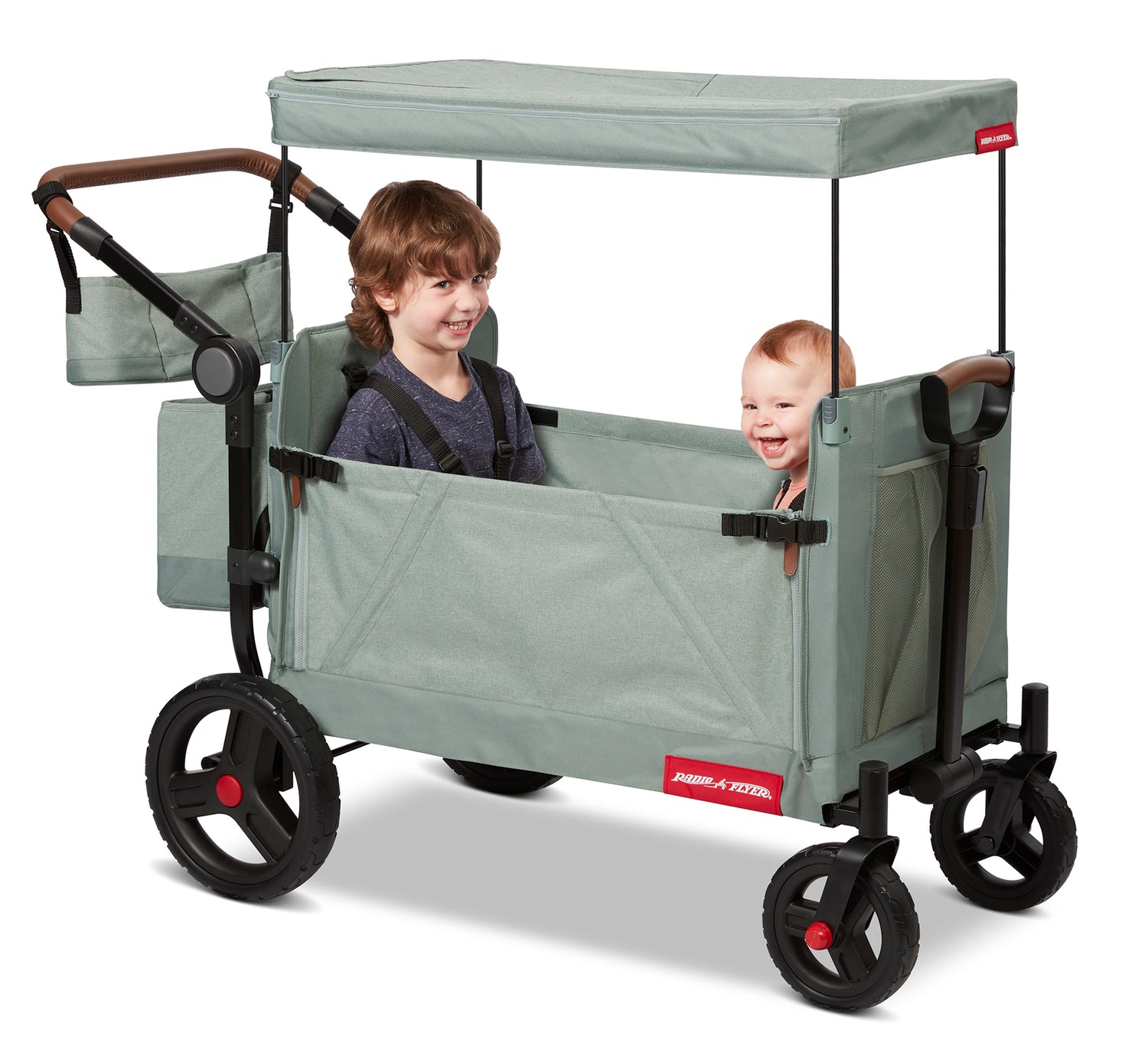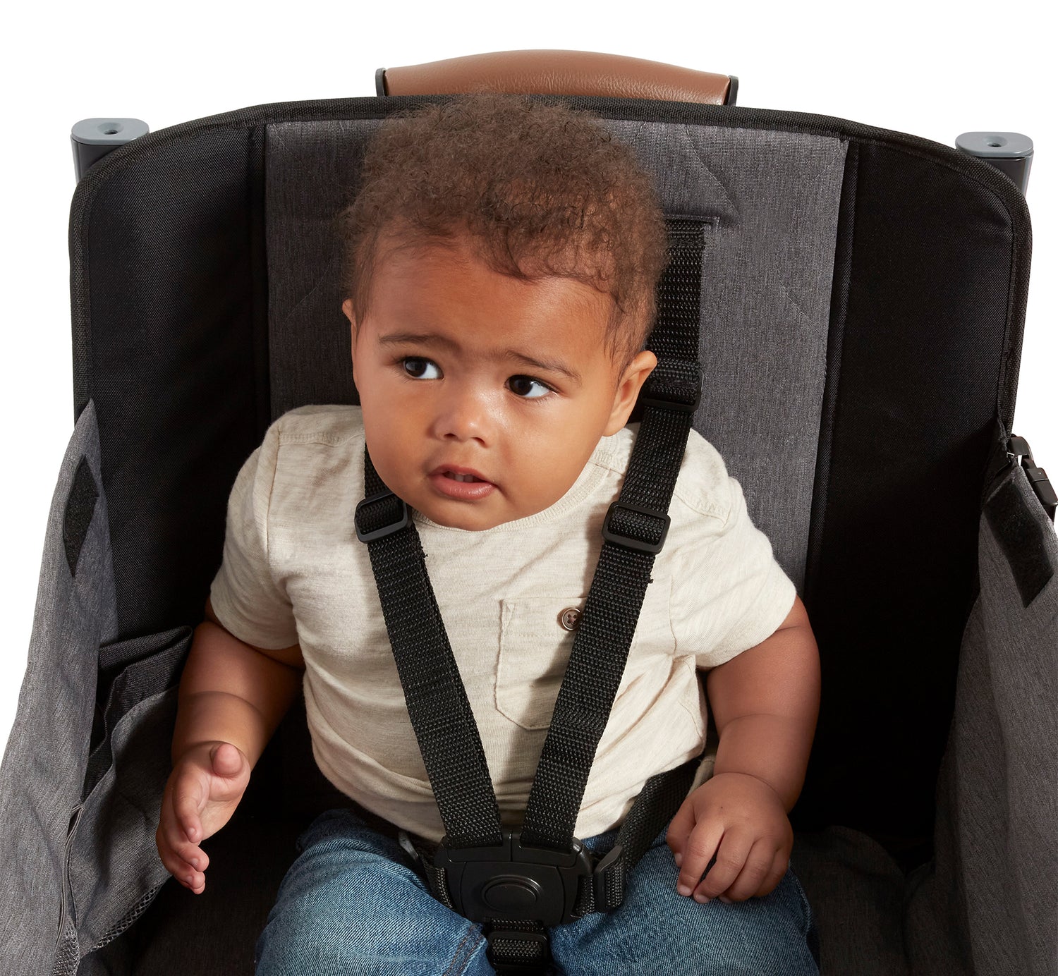Versatile push & pull capabilities make this premium wagon comfortable to maneuver regardless of the type of journey your family is taking. Featuring a Never Fall™ pull handle and a built-in adjustable push bar, use the Radio Flyer Atlas as a push wagon or a folding pull wagon. The two 5-point safety harness seat belts and a rear brake keep babies as young as 12 months secure and comfortable.