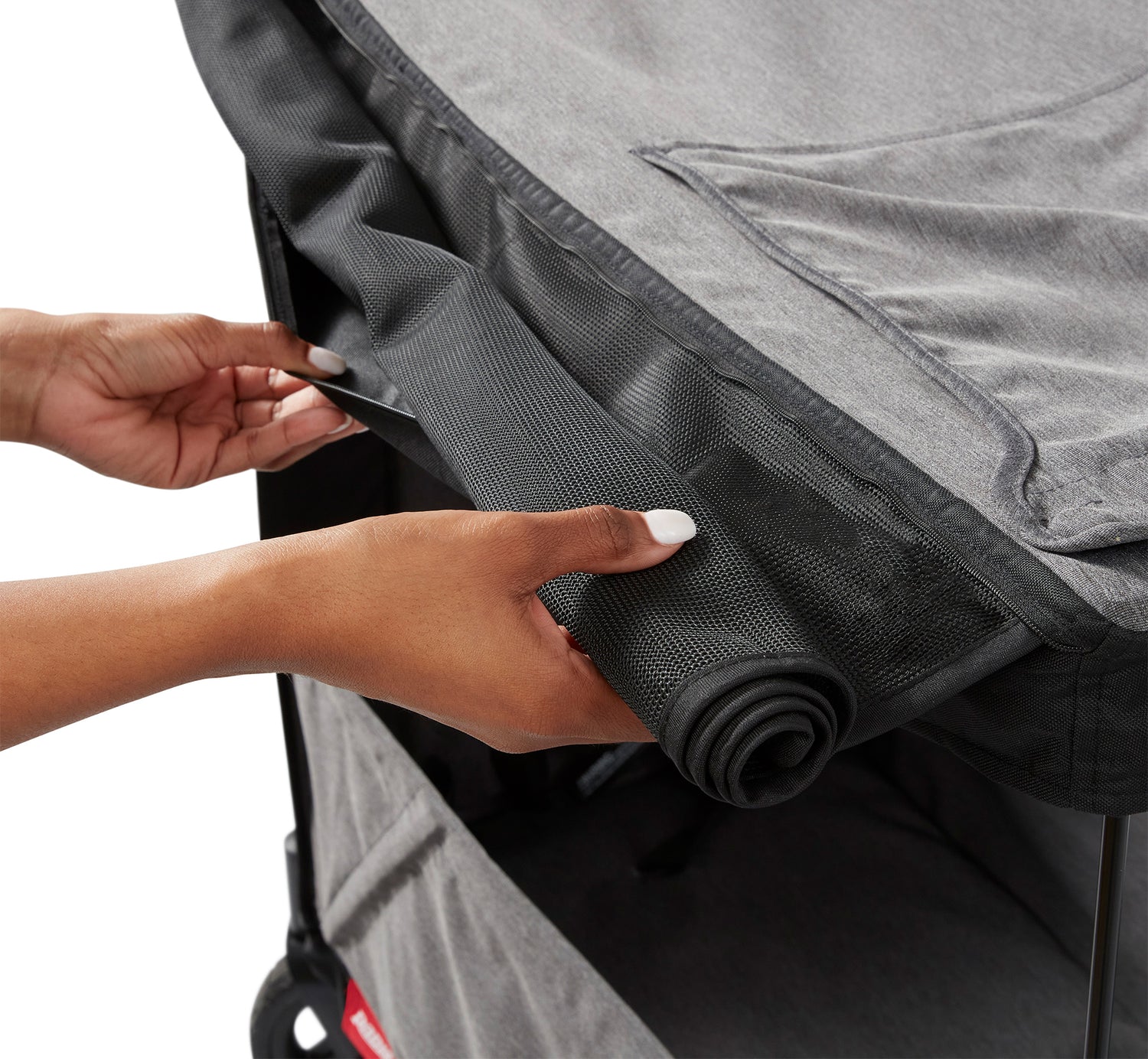 - UV protection canopy with peek-a-boo window and mesh drop-down shades