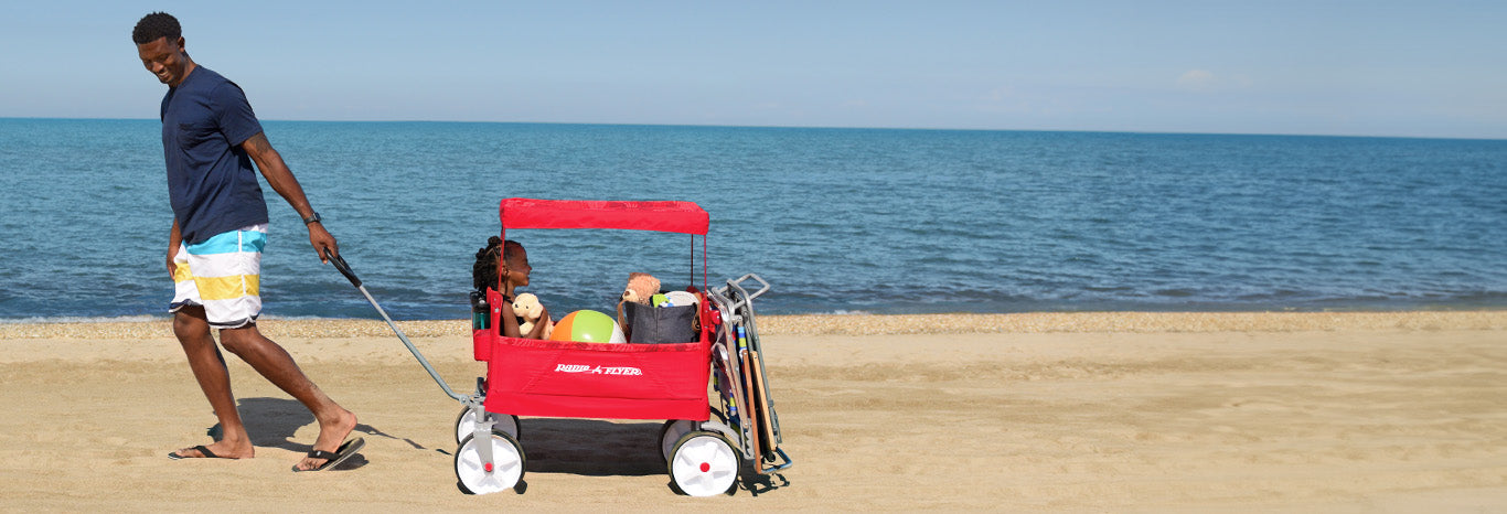 As the name implies, this folding beach wagon performs well on different terrains. The specially designed extra wide wheels and tires provide a smooth ride on sand, making the Beach & Boardwalk Wagon™ the perfect adventure wagon for hauling all of your beach toys and gear.