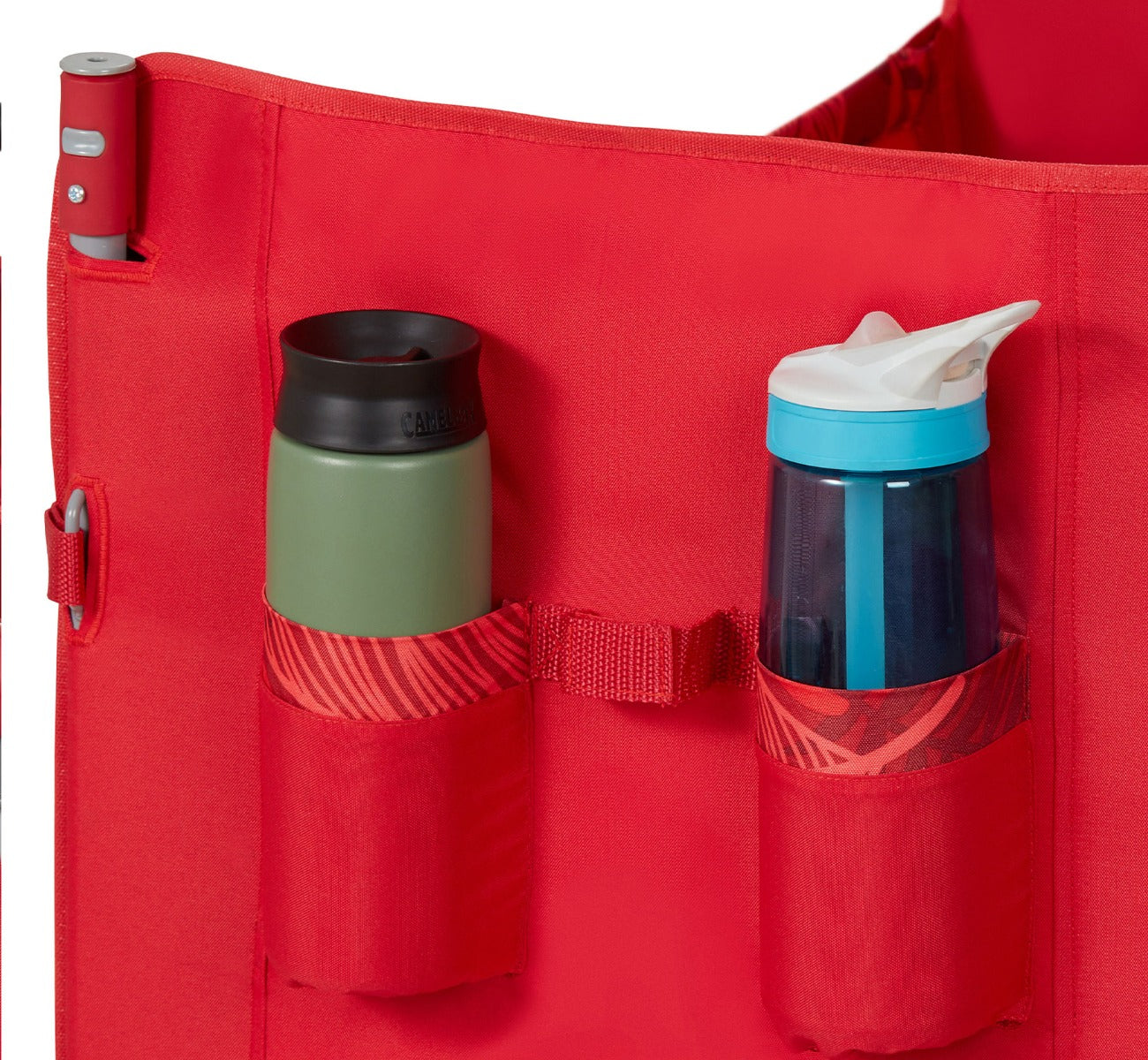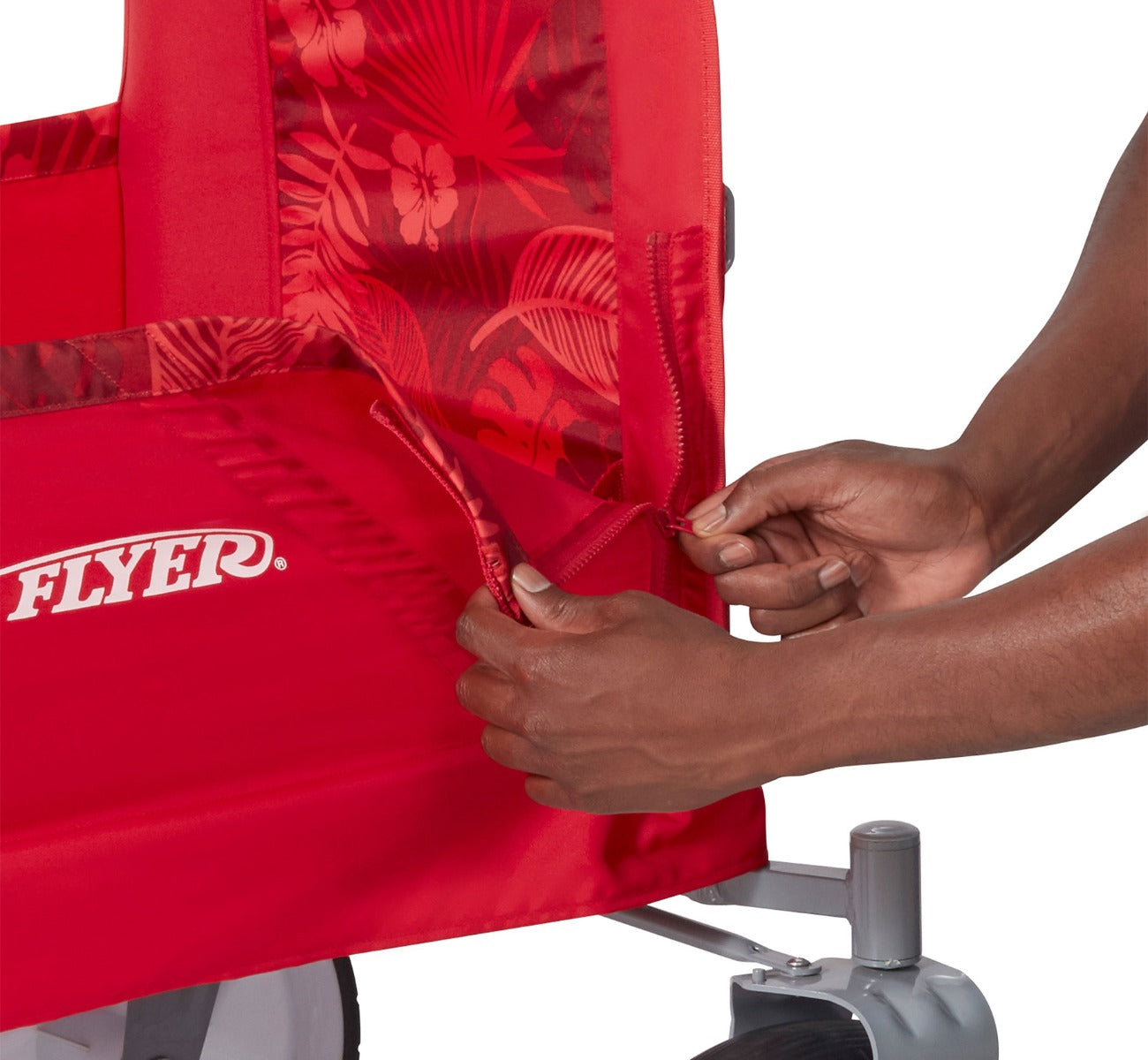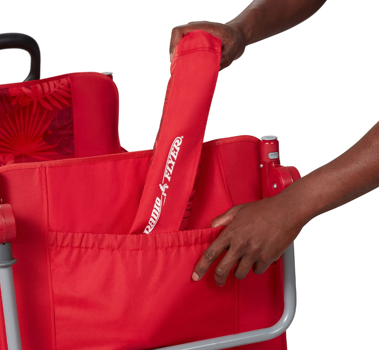 The Beach & Boardwalk Wagon™ is sustainably designed with 100% recycled wagon fabric and features a fun tropical pattern. With comfort features like high seat backs, a thick padded seat with seat belts, a UV blocking canopy, and front cup holders, this collapsible beach wagon is designed with your family in mind. It also features a rear storage bar to carry up to three beach chairs. This bar is not designed to be used as a push bar, and should only be used for storage.