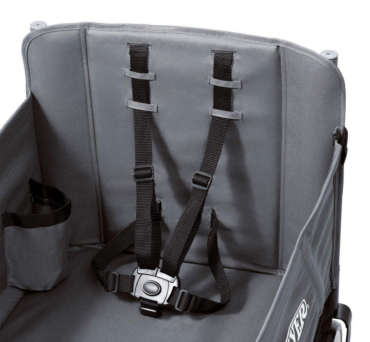 Switch effortlessly between push and pull modes with this innovative gray stroller wagon. Its design includes a traditional wagon pull handle in the front and a fold-away push handlebar on the back, both crafted from sturdy aluminum for maximum durability. Large, smooth rolling wheels provide a comfortable ride, while two 5-point safety harness seat belts and a rear brake ensure your little ones stay secure and comfortable during every journey.