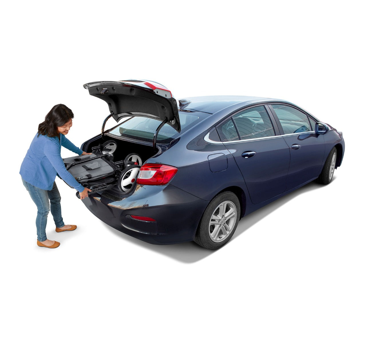 - Front caster wheels for nimble steering and large, 12” easy push rear wheels