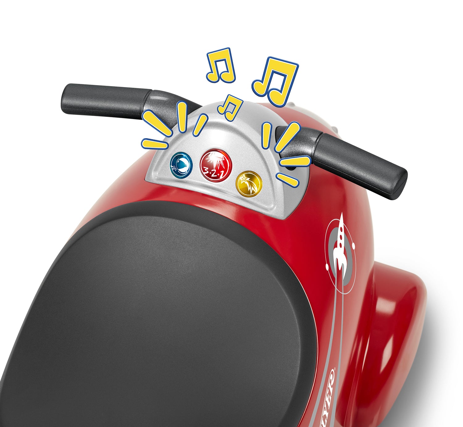 Your child will love racing around on their Retro Rocket®. The four wheel design adds stability to ensure a safe and sturdy ride for little astronauts. The flashing lights, realistic astronaut and space sounds, and clicking nose cone encourage imaginative adventures and hours of endless play.
