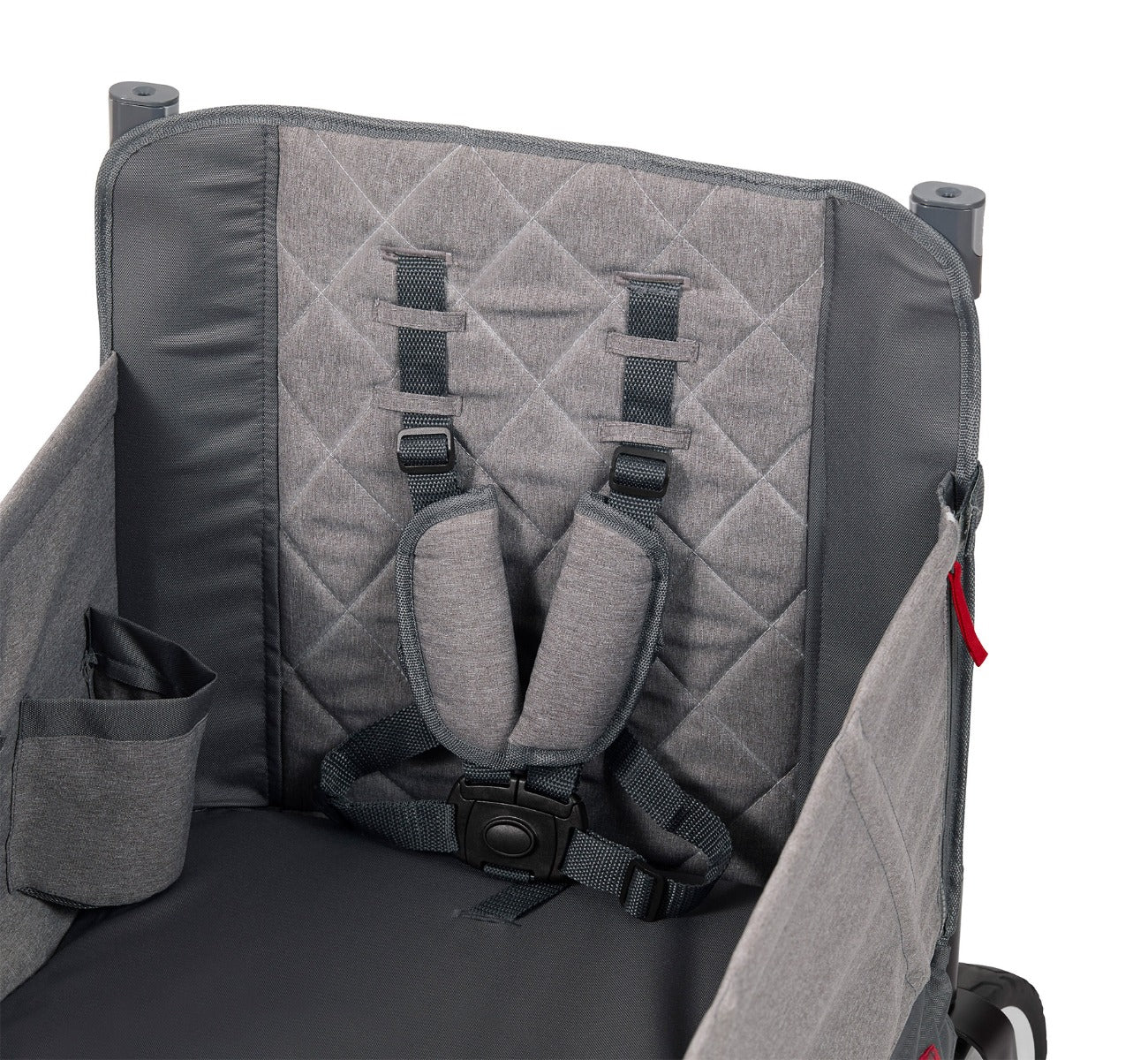 The Odyssey Stroll 'N Wagon® is designed for seamless transitions between a push wagon stroller and a pull wagon. The T-shaped pull handle locks securely in place when not in use, while the fold-away push handle includes deluxe vegan leather handgrips for extra comfort and durability. This push-pull wagon is crafted with sturdy aluminum handles to ensure optimal control in either mode. Designed with safety in mind, the premium stroller wagon features two 5-point safety harness seat belts, soft quilted seatbacks, and a rear brake to keep riders as young as 12 months secure. The Radio Flyer Odyssey Stroller Wagon® offers versatility, comfort, and style for families on the go.
