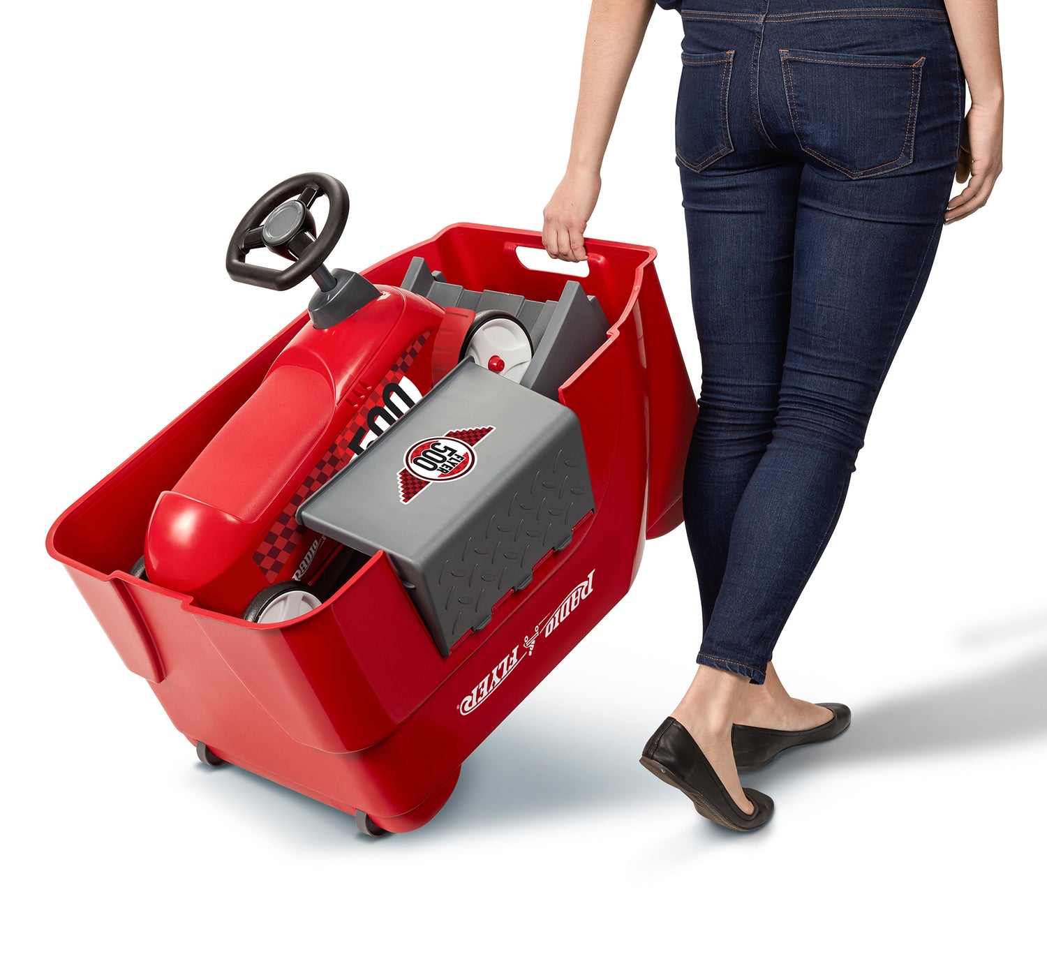 - Ramp and Radio Flyer Little Red Racer® ride-on car fit into the base for easy storage