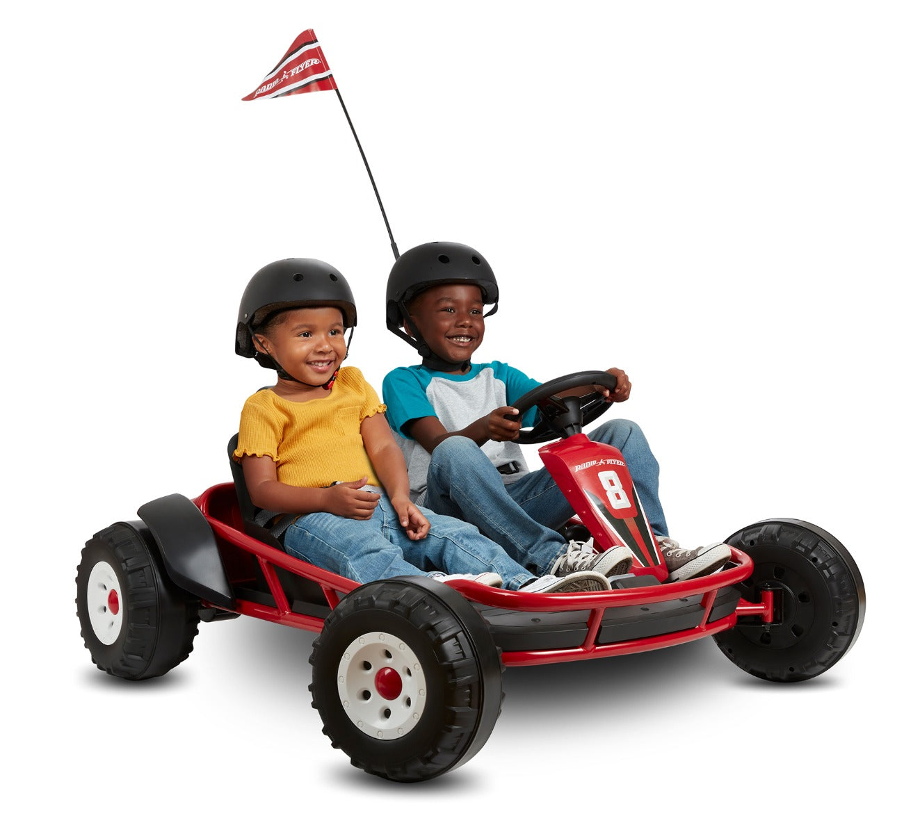 Feel the adrenaline and the thrill of racing with Radio Flyer’s Ultimate Go-Kart for 2! This 24-volt battery powered car features large, high-power motors built to support two riders. It features three speed settings (3, 5 and 8 MPH), single speed reverse, and automatic braking once the pedal is released. The sturdy steel frame and adjustable seat ensure years of fun! Kids will stay safe with the parent-controlled speed lock, seat belts, and high-visibility racing flag. The battery capacity indicator helps riders know when it’s time for a pit stop. The rugged tires have rubber treads for control and off-road fun. 24V battery and charger included. Maximum weight capacity is 130 lbs. For ages 3 to 8 years.